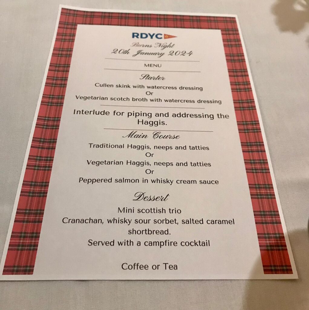 It was a bonny wee evening of entertainment and fine food hosted by our Commodore, Colin MacBower and we thank Mark for his superlatively scrumptious dinner and Victoria and the team for looking after us. Thank you also of course to the evening’s entertainers. David. Alison. Richard and